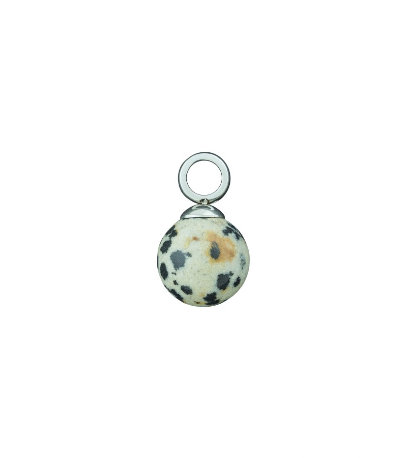 Charmentity Atom Creativ är i dalmatinerjaspis, som sägs öka kreativiteten. Den vita prickiga kulan har ett fäste i blankt rostfritt stål