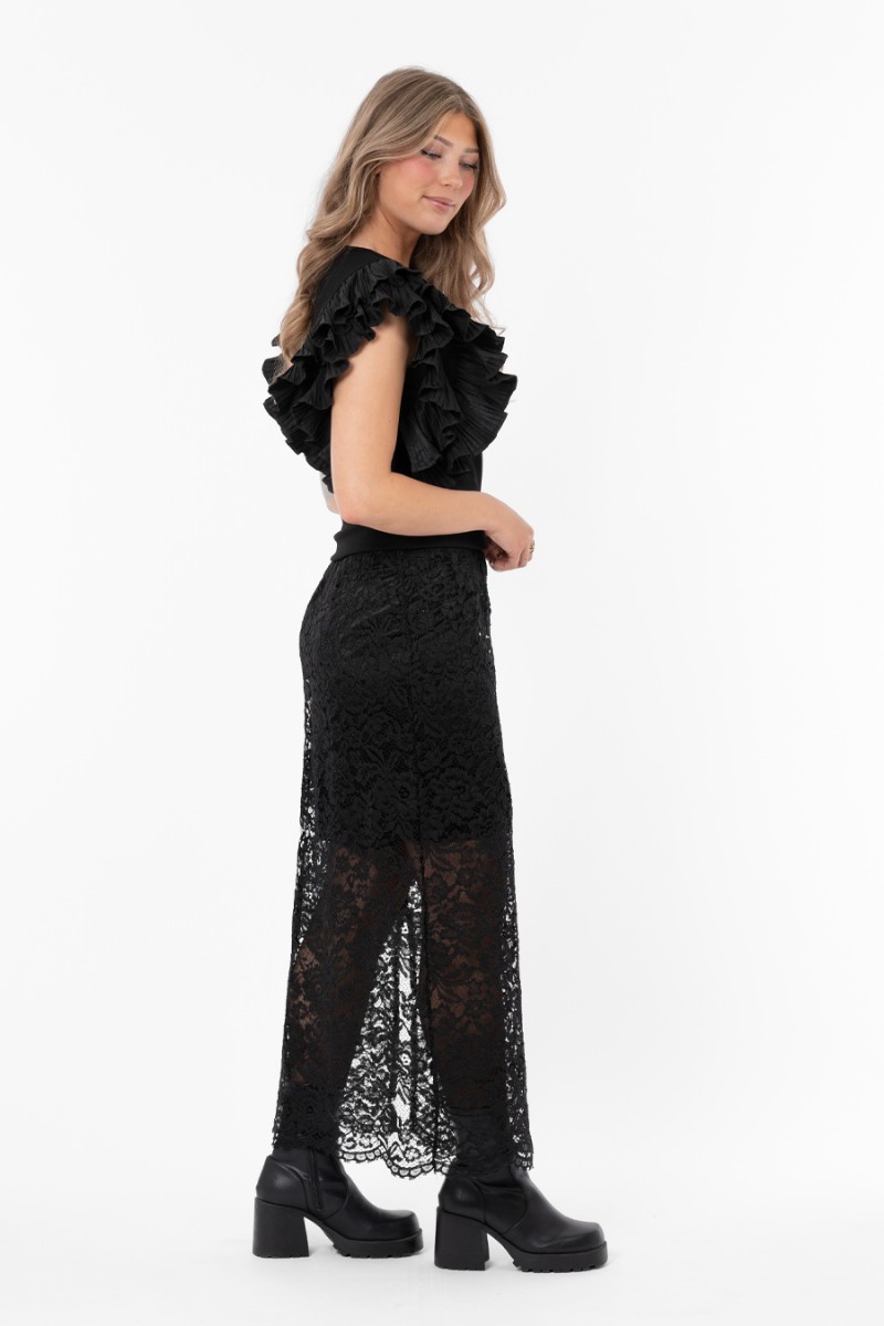 Vi älskar spets! Shirley Spets Kjol är säsongens kanske snyggast kjol och ger din outfit det där lilla extra utan ansträngning. Kjolens yttertyg är gjort i en unik svart spets med otrolig lyster och vågformad nederkant. Midjan på kjolen är gjord i ett glansigt satintyg med resår baktill. Kjolen är trikåfodrad till knähöjd och yttertyget har en hög slits på ena sidan.